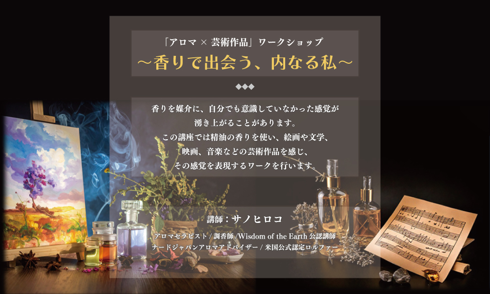 講師には、米アリゾナ州の精油会社Wisdom of the Earth公認講師で、アロマセラピスト、調香師のサノヒロコ氏をお迎えいたします。